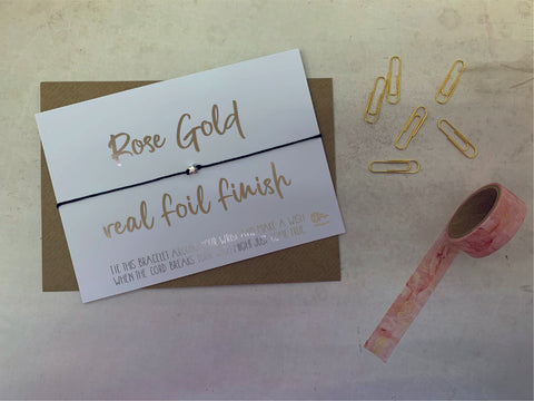 Tibetan silver charm on black waxed cotton cord wish bracelet tied around a piece of A6 (105mm x 148mm) white or kraft 350gsm card, with a choice of black ink, gold foil or rose gold foil print. You can also opt to have it printed onto 4mm thick birch plywood for a truly special gift.