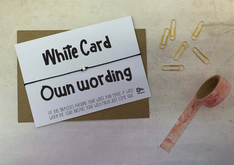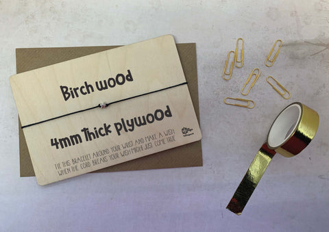 Tibetan silver charm on black waxed cotton cord wish bracelet tied around a piece of A6 (105mm x 148mm) white or kraft 350gsm card, with a choice of black ink, gold foil or rose gold foil print. You can also opt to have it printed onto 4mm thick birch plywood for a truly special gift.