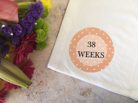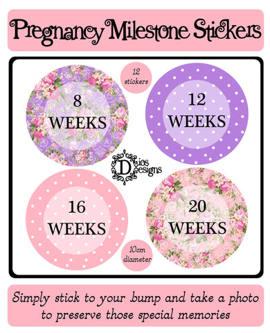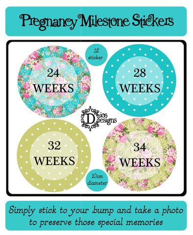 A Set of 12 pre-cut Pregnancy Milestone Stickers which are 10cm in diameter. Simply stick them to your bump to celebrate those key weekly milestones and keep or share the photos to show your bump growing.
