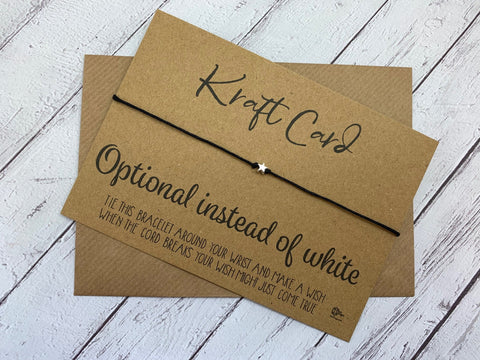 Tibetan silver charm on black waxed cotton cord wish bracelet tied around a piece of A6 (105mm x 148mm) white or kraft 350gsm card, with a choice of black ink, gold foil or rose gold foil print. You can also opt to have it printed onto 4mm thick birch plywood for a truly special gift.