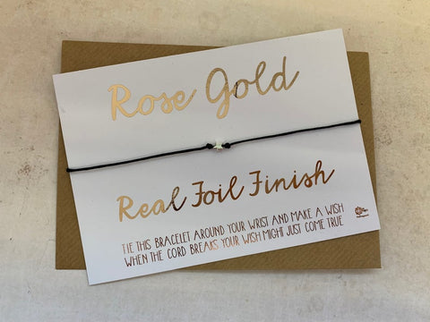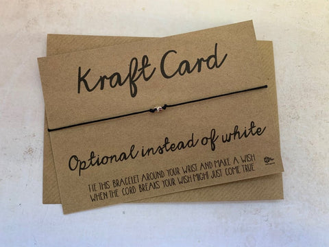 Tibetan silver charm on black waxed cotton cord wish bracelet tied around a piece of A6 (105mm x 148mm) white or kraft 350gsm card, with a choice of black ink, gold foil or rose gold foil print. You can also opt to have it printed onto 4mm thick birch plywood for a truly special gift.