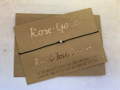 Tibetan silver charm on black waxed cotton cord wish bracelet tied around a piece of A6 (105mm x 148mm) white or kraft 350gsm card, with a choice of black ink, gold foil or rose gold foil print. You can also opt to have it printed onto 4mm thick birch plywood for a truly special gift.