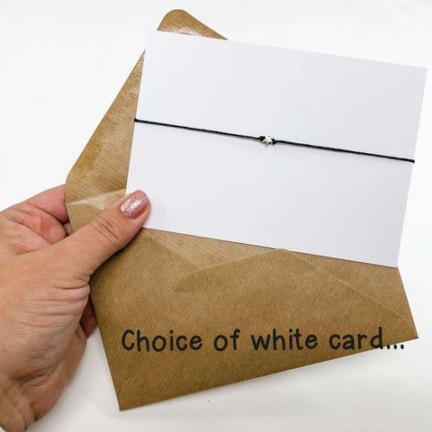 The accompanying A6 sized postcard is printed on high quality 350gsm white or kraft card and comes with a kraft envelope to place the wish bracelet and card inside. You can choose an optional gift message on a sticker or a luxury gift box - additional charges apply for both gift wrap options.