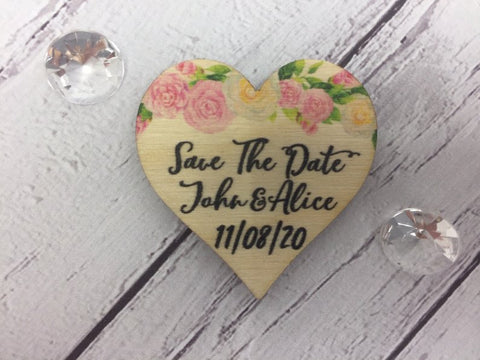 Wooden save the date mini hearts which measure approx 4cm x 4cm. These are cut from 4mm thick birch plywood and printed in colour using a UV flatbed printer.