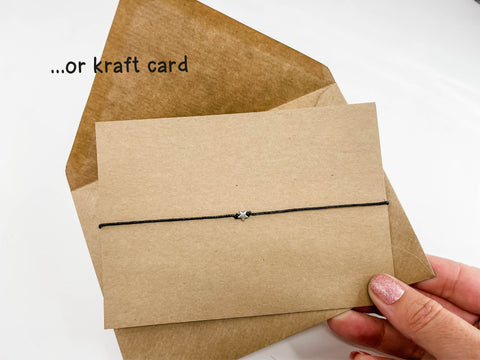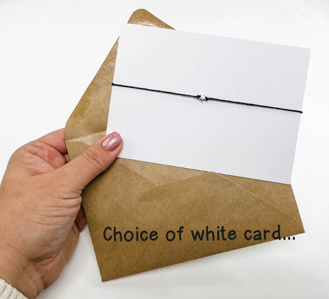 The accompanying A6 sized postcard is printed on high quality 350gsm white or kraft card and comes with a kraft envelope to place the wish bracelet and card inside.