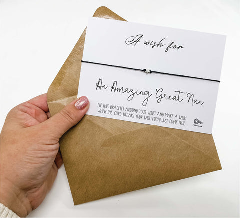 The accompanying A6 sized postcard is printed on high quality 350gsm white or kraft card and comes with a kraft envelope to place the wish bracelet and card inside.